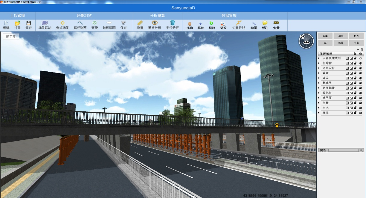 道路輔助設計及施工推演系統,是公司開發的一個完善的三維展示系統,可以提供良好的三維展示、方案對比功能,除此之外還可提供導入導出、圖層管理、場景應用、模型應用、標注和空間分析等屬性應用及動畫應用等功能,改變了傳統施工方案的匯報方式(PPT,word),結合計算機三維技術,達到更形象、更直觀的表達效果。