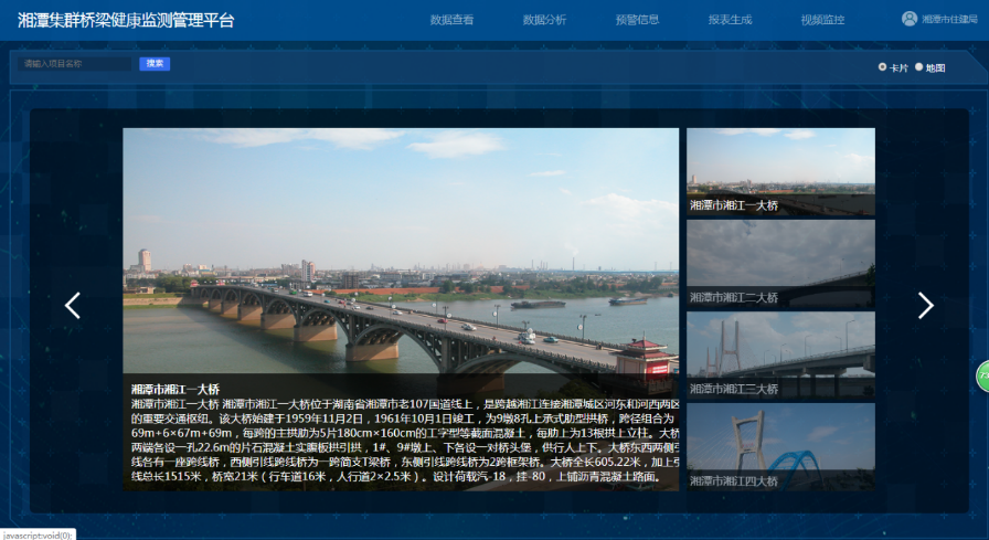 集群橋梁健康監測管理平臺可實現24小時實時在線采集數據功能,并且引入GIS、BIM、物聯網、大數據等前沿技術,通過數據查看、數據分析、預警信息、報表生成、視頻監控等功能,對橋梁運行狀況作出科學合理的分析研判,同時,系統涵蓋了橋梁全生命周期信息的集成與融合,包括對結構損傷機理的宏觀分析、結構變形及破壞趨勢研究、歸納演繹等,為橋梁養護提供了數據支撐。